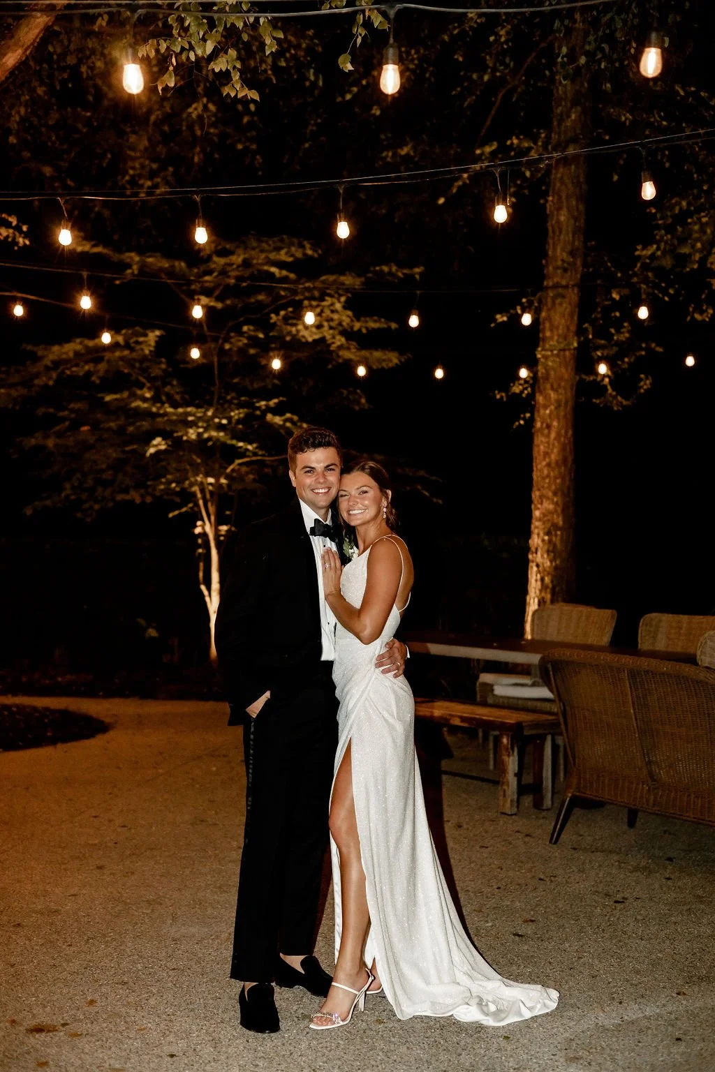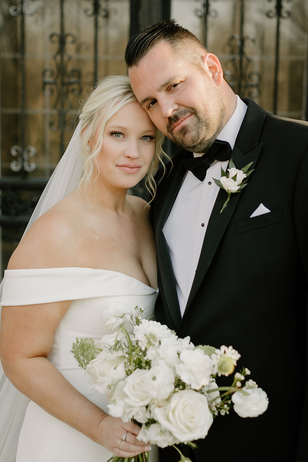 As the sun set, the couple stepped outside for golden-hour portraits that felt straight out of a fashion editorial. The bride’s sleek gown flowed effortlessly against the crisp fall air, while the groom’s modern tailored suit added a polished edge. With the clean, white barn as the backdrop and a dramatic sunset sky, every moment was pure magic.